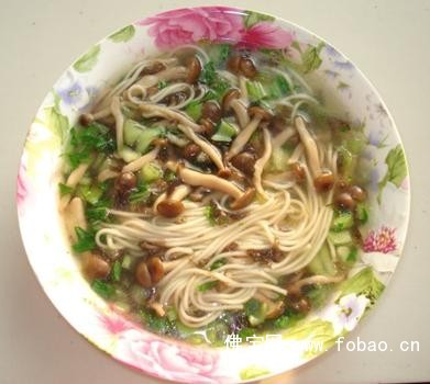 图一是蟹味菇面条成品,先把水做开,放入蘑菇和切丁的豆腐干煮,开锅后放入面条,之后放盐,蔬菜精,面条快熟时放入油菜碎和紫菜,紫菜也可以早些时候放多煮一会儿也可以。出锅放香油即可。