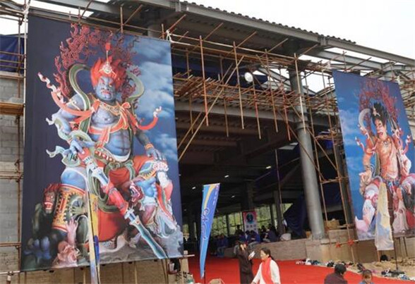 经堂内,宝盖辉烨,经幢巨丽,药师佛画像悬挂两旁。置身于此,仿若来到药师佛国。