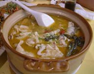 材料:素鲍鱼一包、(或素如意鱼一条) 泡红椒100克,泡生姜35克,蒜50克,酸菜200克,(市场有专门“酸菜鱼”酸菜卖)野山椒25克,素高汤500克,精盐5克,胡椒粉1.5克,味精3克,姜葱少许,植物油75克,香油15克。