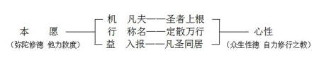 上面图表中,本愿二字下面括号里有一行小字:弥陀修德,他力救度。心性后面是圣者上根定散万行凡圣同居,这是站在众生心性立场来判断的;下面有一行小字:众生性德,自力修行之教。圣道法门为什么作这样的判断呢?它是在哪个立场上呢?它是站在众生性德立场上来判断的。