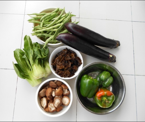 所需原材料:香菇、木耳、茄子、菜椒 、瓢儿白、四季豆。