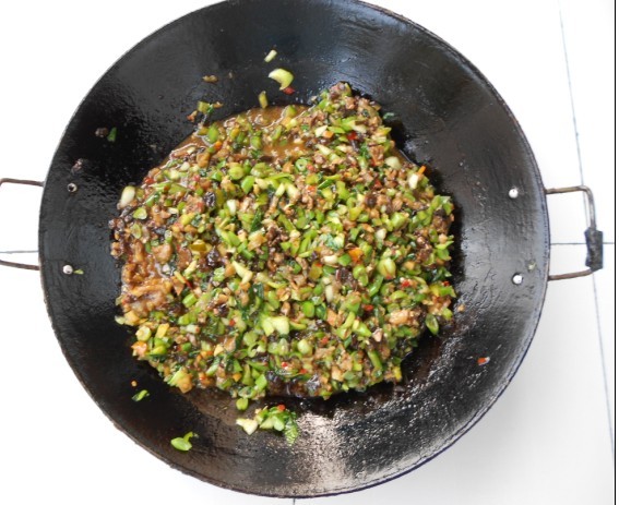 2、四季豆洗净后放到开水锅里,煮到8成熟,起锅后,切碎,和菜椒 、瓢儿白拌在一起,加少许盐、磨菇精、素蚝油、花椒油、切成碎末的老姜。