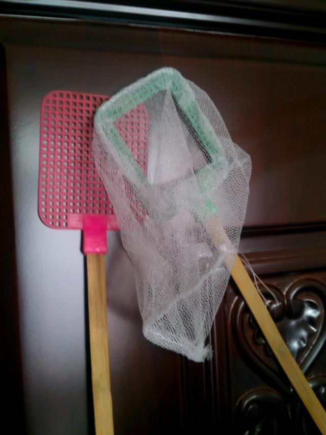 发现苍蝇时,先用带小网的苍蝇拍将苍蝇罩住,再用另外一个将小网的口挡住,然后打开窗户把小苍蝇放出去就可以了。