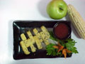 3、用土豆泥包好2,然后挂糊油炸至金黄香脆,切片后装盘。