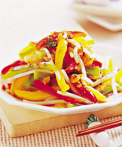 提示:烫好豆芽及三色椒后,最好用冷水冲洗,可增加爽脆口感。