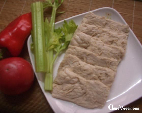 1、素肉大片用水泡软,挤干水份,用少许淀粉、盐、味精、腌制抓捏一下使之入味;