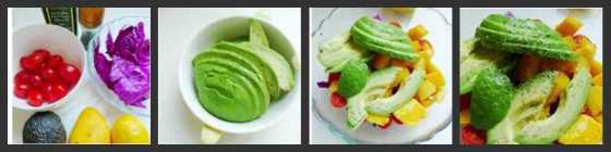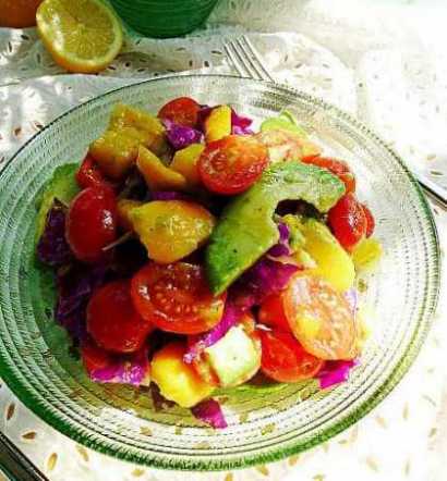牛油果1个、芒果1个、樱桃番茄15个、紫甘蓝3片、柠檬半个、食盐适量、黑胡椒适量、橄榄油适量