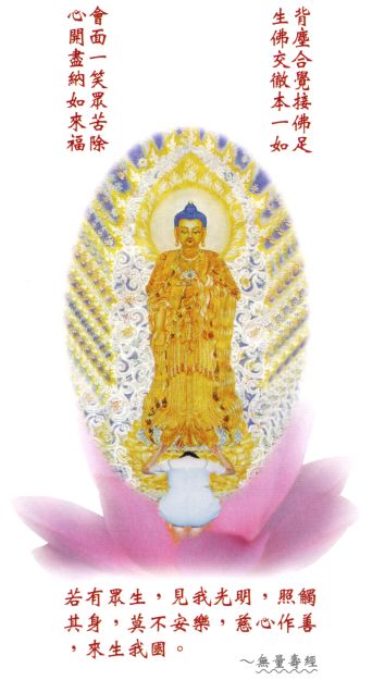 再观想,佛放清净慈悲的光明,由我们顶门照入全身,使全身全心都清净光明,每个细胞每个毛孔都欢喜放光,光明遍照十方,普摄一切众生同沐佛光。