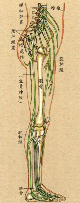 (五)、由腰椎、荐椎出来之‘神经’,如坐骨神经、肠下腹神经....(见下图)会受压迫,产生种种症状。平日姿势,腰塌前太甚者,常患‘坐骨神经痛’,及下腹部疾患。
