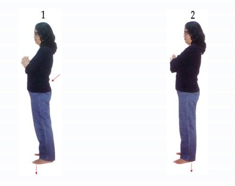 ·若以‘脚跟’作支点,腰部脊椎较直,不会塌入腹部。腰背,及脚、趾、肌肉都轻松。且易深呼吸(丹田呼吸)。若能再体会,由头顶上拔之势,则如拉一绳之二端,绳自端直、挺拔、站久也不吃力。