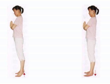 注:不习惯足跟支力的人,可以先试‘垫起脚尖—放下’,体会刚放下(足跟落地)那一刹间,以‘足跟后部’支力的感觉,即是足跟支力的站立状况。如下图:
