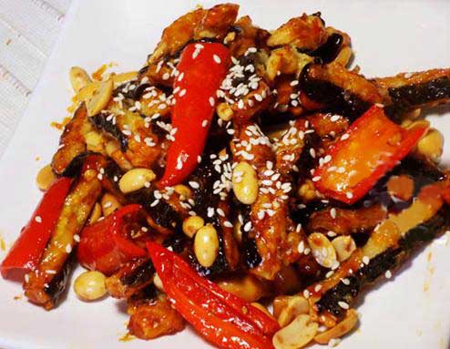 5、放入素鱼乾拌炒均匀,辣椒也丢入