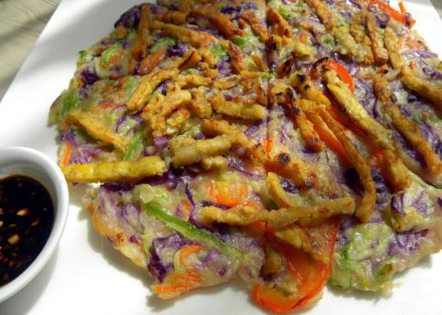 4、平底锅加少许油置于微火上,将蔬菜糊倒入锅中,摊平,将煎好的天贝均匀的洒在上面,粘紧;