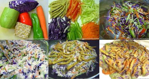 原料:天贝、紫甘蓝、彩椒、胡萝卜、西葫芦、面粉