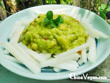 6、取一个盘子,将梨丝围一圈,将酪梨色拉放中间。