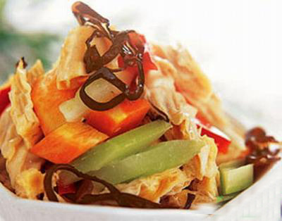 6、 将腐竹段、莴苣片、胡萝卜片、冬笋片、木耳装入盆内,加入精盐、蘑菇精,浇上热花椒油拌匀,装盘即成。