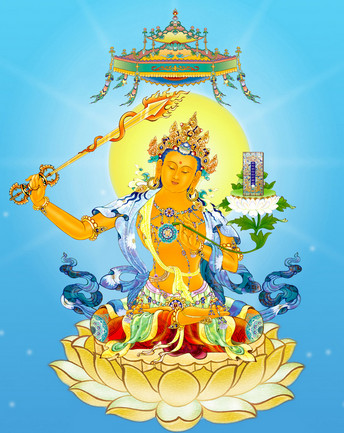文殊师利,或云曼殊室利,此云妙德,亦云妙吉祥。生于舍卫国,多罗聚落,梵德婆罗门家,从母右胁出。身紫金色,堕地能语,寻于佛所出家。(见文殊般涅槃经)首楞严三昧经言,过去无量阿僧祇劫,南方世界,名曰平等,佛号龙种上如来,即文殊是。央掘经言,现在北方常喜世界,欢喜藏摩尼宝积佛,即文殊是。而悲华经言,阿弥陀佛,为转轮王时,第三王子,名曰王众,于宝藏佛所,发阿耨多罗三藐三菩提心。愿于来世,行菩萨道,无有齐限,庄严佛刹。令三千大千世界,恒河沙等十方佛土,为一佛刹,大宝填厕,又无恶触,及诸女人,及其名字。亦无声闻辟支佛等。一生菩萨,充满其中。佛即号为文殊师利。于未来世,南方世界,名曰清净无垢宝窴,成阿耨多罗三藐三菩提,号普现如来。观佛三昧海经言,时世尊为诸大众,说观佛三昧已,文殊菩萨复告大众言,过去宝威德如来时,有长者子,名曰戒护。在母胎时,受三归依。年至八岁,父母请佛,于家供养。童子见佛,安行徐步,足下生华,有大光明。见已欢喜,为佛作礼。礼已谛观,目不暂舍。一见佛已,即能除却百万亿那由他劫生死之罪。从是已后,恒得值遇百亿那由他恒河沙佛。是诸世尊,皆说如是观佛三昧。其后有百万佛出,皆同一字,名栴檀海。时彼童子,亲侍诸佛,闲无空缺,礼佛供养,合掌观佛。观佛功德因缘力故,复得值遇百万阿僧祇佛。从是已后,即得百万亿念佛三昧,得百万阿僧祇旋陀罗尼。既得此已,诸佛现前,说无相法。须臾之间,得首楞严三昧。时彼童子受三归依,一礼佛故,谛观佛相,心无疲厌。由此因缘,值无数佛。何况系念,具足思惟,观佛色身。时彼童子,岂异人乎,即我身是。佛告阿难,汝持文殊师利语,遍告大众,及未来世众生,若能礼拜者,若能念佛者,若能观佛者,当知此人,与文殊师利等无有异。又文殊发愿经,与普贤行愿品末后偈略同。终云,愿我命终时,灭除诸障碍,面见阿弥陀,往生安乐刹。生彼佛国已,成满诸大愿,阿弥陀如来,现前授我记。严净普贤行,满足文殊愿,尽未来际劫,究竟菩萨行。夫文殊普贤,华严二圣,所陈行愿,说法度人,莫不以念佛为基,以净土为归。世有执华严薄净土者,当知所鉴焉。