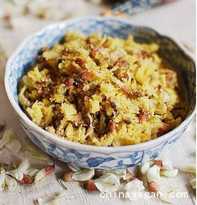 5、锅内烧热油下拌散的槐花炒1分钟,倒入盐,胡椒粉搅匀即可。