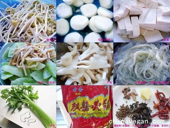 原料:如下图,从左上依次为:黄豆芽、马蹄、豆腐、莴笋和黄花菜、平菇、红薯粉条、芹菜