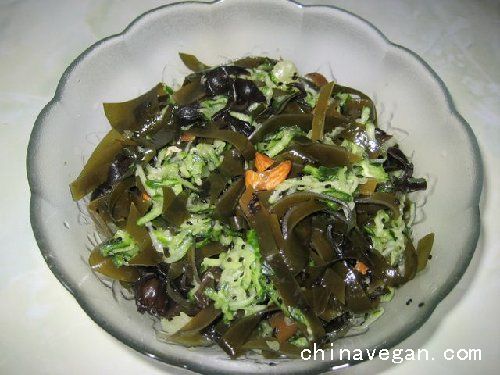 原料:干海带 蒜 黑芝麻 黄瓜 杏仁 黑木耳