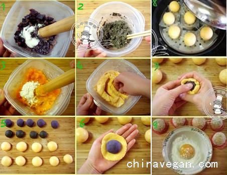 : 糯米粉、澄粉、南瓜、紫薯、速溶黑芝麻粉、糖、植物黄油、细椰丝。做法: