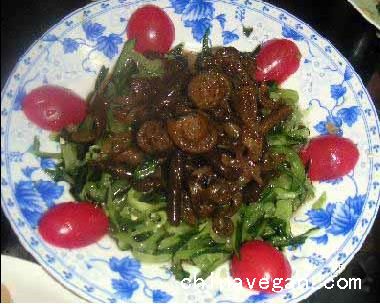做法:1、黄瓜洗净切丝;海茸水发后开水焯烫,分别用盐腌制;