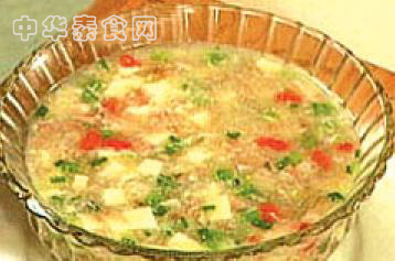调料:植物油50克, 大葱3克,盐3克,胡椒粉1克、 豌豆淀粉35克、、素高汤粉适量(或用蘑菇精代)