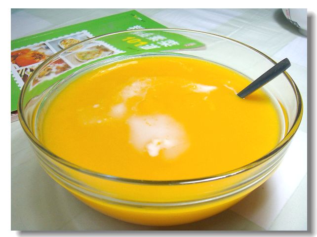 原料:南瓜、椰奶 做法: 1、将南瓜去皮、切大块,放入锅中蒸熟。 2、取部分南瓜块放入搅拌机,加水(水量可决定汤的浓稠度,可稀可稠)、一小勺盐(不要多,调出微微的咸味即可),开机搅拌成细细的茸状,倒出,在上面淋上少许的椰奶即可。 小创意:如果椰奶够浓,可以在黄色的浓汤上淋出个漂亮的形状,例如心形等。