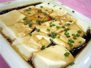 豆腐:分为南、北两类型,南豆腐是将点卤 ( 通常用石膏 ) 后形成的豆腐脑倒入布包经轻压后制成,色雪白、质细嫩。北豆腐是将点卤 ( 通常用盐卤 ) 后形成的豆腐脑倒入模具经紧压后制成,色乳白、质较老,但蛋白质含量较高。有人将豆腐形容为将人体需要的各种营养素都集中在一起的食品。