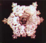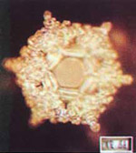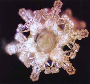 这是听了萧邦的「离别曲」的水结晶照片。图片报告说:没有比得到这张水结晶时更令人感到吃惊的了。摄制这张照片的显微镜的倍数与其它照片是一样的,但是「离别」的曲调竟让基本形状的水结晶被完整地分化得更小,成为地地道道的离别模样。
