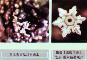 这是在接受500个人「美好讯息」意念前后的水结晶照片。原本的水看不出形状,但在接受美好讯息后,呈现出美丽动人的结晶!